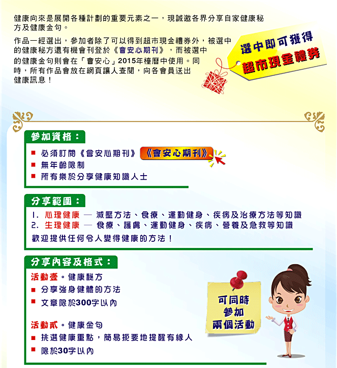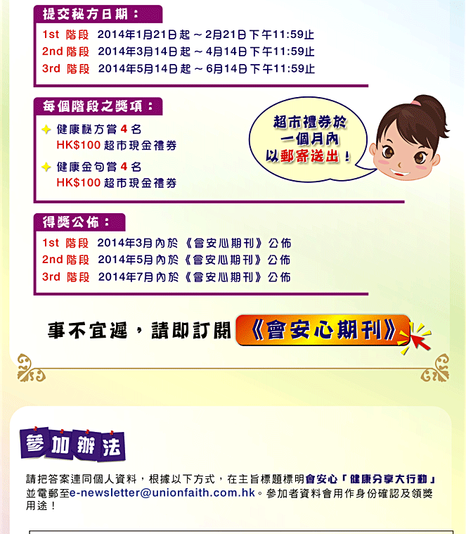• 本公司將根據參加者之資料,於 2014 年 3 、 5 及 7 月內於《會安心期刊》公佈得獎事宜,