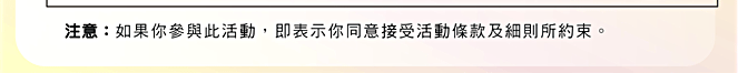 參加者必須同意活動條款及細則方可參加活動。參加者在參與活動之同時,即代表其已細閱並同意接受本公司就有獎活動所訂立的條款及細則,並同意接收本公司日後的活動及優惠資訊。若參加者不希望再收到有關推廣訊息,可以書面方式通知本公司。 |